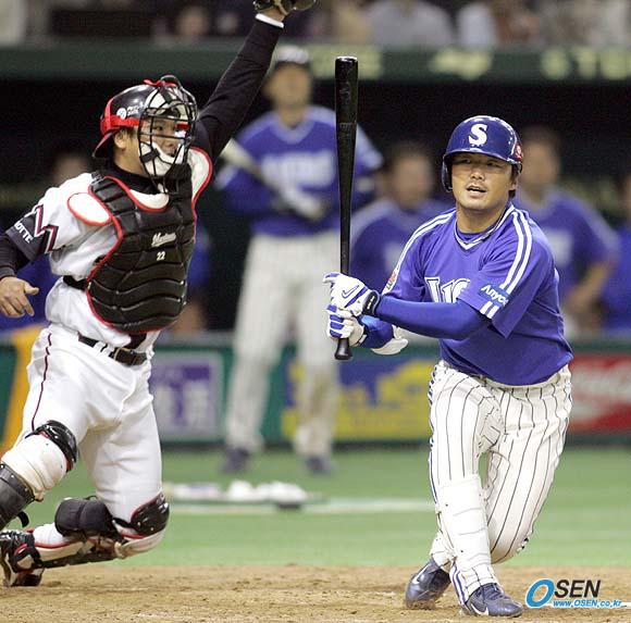 13일 일본 도쿄돔에서 펼쳐진 코나미컵 아시아시리즈 2005 삼성과 롯데 마린스의 결승전서 롯데가 5-3으로 승리했다. 9회초 2사 1,2루서 삼성의 마지막 타자 김대익이 풀카운트서 떨어지는 변화구에 헛스윙 삼진 당하는 순간 사토자키 포수가 번쩍 일어나고 있다./도쿄돔=손용호 기자 spjj@osen.co.kr [Copyright ⓒ OSEN(www.osen.co.kr) 무단전재 및 재배포 금지]