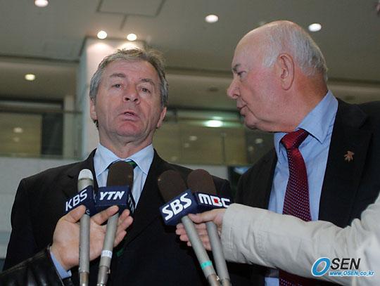 오는 16일 한국과 친선경기를 가질 세르비아-몬테네그로 대표팀이 14일 낮 인천공항을 통해 입국했다. 일리야 페트코비치 감독이 세르비아-몬테네그로 축구협회 직원의 영어 통역으로 한국 기자들과 인터뷰하고 있다./인천공항=주지영 기자 jj0jj0@osen.co.kr [Copyright ⓒ OSEN(www.osen.co.kr) 무단전재 및 재배포 금지]
