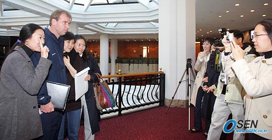 16일 세르비아-몬테네그로와의 친선경기에 앞서 한국대표팀이 15일 오전 서울 홍은동 그랜드 힐튼 호텔에서 합동 인터뷰를 가졌다. 핌 베어벡 코치가 여성 팬들과 함께 사진을 찍고 있다./주지영 기자 jj0jj0@osen.co.kr [Copyright ⓒ OSEN(www.osen.co.kr) 무단전재 및 재배포 금지]