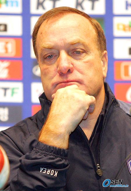 16일 세르비아-몬테네그로와의 친선경기에 앞서 한국대표팀이 15일 오전 서울 홍은동 그랜드 힐튼 호텔에서 합동 인터뷰를 가졌다. 선수들의 인터뷰에 이어 기자회견을 가진 아드보카트 감독이 생각에 잠겨 있다./주지영 기자 jj0jj0@osen.co.kr [Copyright ⓒ OSEN(www.osen.co.kr) 무단전재 및 재배포 금지]