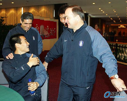 16일 세르비아-몬테네그로와의 친선경기에 앞서 한국대표팀이 15일 오전 서울 홍은동 그랜드 힐튼 호텔에서 합동 인터뷰를 가졌다. 조원희가 통역 박일기 씨에게 아드보카트 감독이 한 말을 웃으며 전해 듣고 있다./주지영 기자 jj0jj0@osen.co.kr [Copyright ⓒ OSEN(www.osen.co.kr) 무단전재 및 재배포 금지]