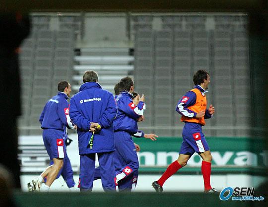 16일 한국 대표팀과의 친선경기에 앞서 세르비아-몬테네그로 대표팀이 15일 상암 월드컵 경기장에서 비공개로 마지막 훈련을 실시했다. 일리야 페트코비치 감독(등만 보이는 사람)이 지켜보는 가운데 선수들이 그라운드를 달리며 몸을 풀고 있다./상암=주지영 기자 jj0jj0@osen.co.kr [Copyright ⓒ OSEN(www.osen.co.kr) 무단전재 및 재배포 금지]