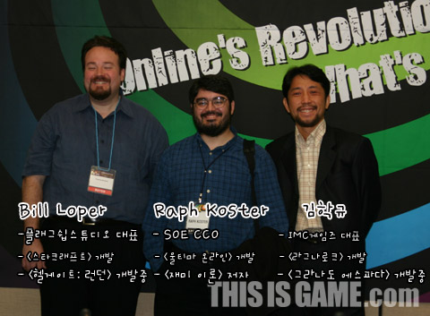 [KGC 2005] 기조연설자들 합동 인터뷰 [디스이즈게임 - 임상훈기자] 김학규(IMC게임즈 대표), 라프 코스터(SOE 이사), 빌 로퍼(플래그쉽스튜디오 대표). KGC 2005의 기조연설을 맡은 세 사람이 10일 오후 1시께 지스타 309호에서 기자회견을 했습니다. 기조 연설 직후로 점심식사도 걸렀기 때문에 비교적 짧게 진행돼 조금 아쉬웠죠. 하지만 게임계 현황에 대한 이 바닥 고수들의 이야기에는 녹록치 않은 경륜이 묻어 나왔습니다. 아참, 새로운 사실을 들었습니다. 할리우드 톱스타 벤 애플렉이 마니아고, 보스턴 레드삭스의 커트 실링이 에 푹 빠졌답니다. 자고로 개발자는 수염이 텁수룩해야 된다고 몸으로 웅변하는(^^) 이들의 이야기를 한번 들어보시죠. /디스이즈게임 TIG> 빌 로퍼 이사는 기조연설에서 에 대한 언급을 많이 하던데, 언제부터 이 게임을 알게 됐나? 실제 미국 개발자들 사이에서 이 게임이 화제가 되고 있는가? 로퍼> 미국에서는 굉장히 다른 모델, 특히 비즈니스 모델 측면에서 관심을 많이 가지고 있다. 개인적으로는 많이 해보지 못했다. 하지만 재미있고, 간단한 캐주얼 게임인데 아이템을 통해 수익을 거두고 있다는 사실에 대해 미국 게임업계 관계자들은 굉장히 놀라워하고 있다. 코스터> 는 못해봤고 를 즐긴다. MMORPG에 관해서는 7~8년 전부터 이야기가 많았는데 캐주얼 게임에 관한 이야기는 몇 년 안 된다. 아주 새로운 이야기는 아니다. TIG> 기조연설에서 현금거래에 대한 이야기도 있었는데, 이 문제에 대해 어떻게 생각하는가. 로퍼> 미국에서도 논란이 많다. 게임성을 훼손한다며 적극적으로 반대하는 사람도 있고, 시간과 돈을 투자한 유저가 할 수 있는 자연스러운 현상으로 이해하는 사람도 있다. 개인적으로는 최근 SOE의 아이템 현금거래 허용에 대해 잘했다고 생각한다. 유저들의 거래에 ‘안정성’을 확보해줬기 때문이다. 코스터> 법적인 문제가 있었다. 아이템 거래가 인정될 경우, 게임사가 은행이 되는 셈이니까. 보험도 들어야 하고. 그런 문제 때문에 주저하는 경향이 있었다. 예전에 SOE의 고객관리 예산의 40%가 현거래에 관한 각종 불만에 대응하는데 사용됐다. (현금거래 인정 이후 커스터머 서비스를 더 잘하게 됐다는 긍정적 의미를 우회적으로 표현한 것 같네요.) 김학규> RMT(Real Money Transaction)에는 두 종류의 모델이 있다. 물약이나 게임상에서 이득을 주는 아이템을 개발사가 제공하는 모델이 있고, 유저들 간의 거래를 안전하게 보장해주는 모델이 있다. 전자의 경우는 평생무료화 게임이 주로 하는데 MMO가 택할 길은 아니라고 생각한다. 후자는 회사가 책임져주는 개념으로, 라프가 이야기한 은행보다는 부동산에 가까운 개념인데 필요하다고 본다. 분명히 RMT는 통제할 필요가 있다. 하지만 금지하는 게 답은 아니다. 인간의 사회활동에서 경제활동을 빼놓고 생각할 수 없듯, 어느 정도 인정해줘야 한다. 부작용을 막을 수 있는 방식으로, 안전하게 거래할 수 있게. TIG> 지스타는 봤나? 앞으로 게임쇼는 어떻게 될 것 같은가? 코스터> 컨퍼런스에만 있느라고 게임쇼는 못 봤다. ^^;; 게임쇼는 ▲ 트레이드쇼(업계 관계자들을 위한 쇼) ▲ 컨슈머쇼(유저들을 위한 쇼) ▲ 개발자를 위한 것, 이렇게 세가지 종류가 있는 것 같다. E3는 트레이드쇼에 가까운데, 앞으로는 컨슈머쇼가 더 발달할 것으로 본다. 블리즈콘도 그렇고, 예전에 도 그런 쇼를 했었고. IGN이나 게임스파이 같은 곳에서도 유저 대상의 쇼를 기획하고 있고…. 개발자를 위한 컨퍼런스에서 게임계가 아닌 다른 영역, 이를테면 만화나 영화 쪽 사람들이 와서 함께 배웠으면 더욱 좋을 것 같다. 로퍼> 자세히는 못 봤다. 첫인상은 판타스틱했다. 라이프찌히에서 열린 게임쇼를 갔는데 개발자 컨퍼런스를 유저들이 게임 구경하는 곳에서 했다. 그런 형태가 괜찮은 것 같다. 김학규> 우리 부스만 잠깐 가봤다. ^^ 패키지 시절에는 E3 같은 데 가서 패키지 보고, 그것 들여오는 그런 식으로 했는데 인터넷이 발달되면서 그럴 필요가 없어졌다. 그냥 소비자의 반응을 확인하는 수준이다. 언론에서는 ‘몇 백 만불 계약실적을 올렸다’ 이런 기사들 나오는데 실질적으로는 무의미하다. 실제 이야기는 이미 다 되어 있고, 게임쇼는 계약서에 사인하는 세리머니 같은 자리가 돼버렸다. 지스타는 컨슈머쇼와 트레이드쇼를 결합한 것인데, KGC를 함께 하는 것은 소비자들에게 더 볼거리를 주는 서비스라고 생각한다. 게임 자체가 대형화하면서 자기 회사 제품을 특화한 이벤트들은 더욱 가속화할 것이다. 그러므로, KGC 같은 요소나 엔터테인먼트 요소를 좀더 강조해야 하지 않을까 생각한다. TIG> 게이머는 ‘돈키호테’라는 부정적인 인식이 있는 것 같다. 게이머에 대한 부정적인 인식을 제고하기 위해 어떻게 해야 될까? 로퍼> 게이머라는 어둡고 칙칙한 곳에서 게임만 몰두하는 요상한 놈이라는 인상을 준다. 실제 나도 그랬었고. ^^ 하지만 유명한 사람들이 자기가 게임을 좋아한다고 ‘커밍아웃’ 하면 도움이 될 것이라고 생각한다. 로빈 윌리엄스는 마니아고, 커트 실링은 , 벤 애플렉은 에 푹 빠졌다고 말했다. 이런 게 도움이 됐다. 코스터> 시간 문제