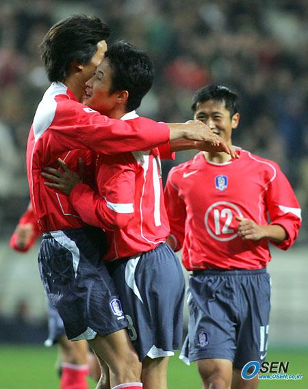 16일 저녁 서울 상암 월드컵경기장에서 벌어진 한국-세르비아 몬테네그로의 친선경기 전반 최진철이 헤딩 선제골을 넣은 뒤 프리킥으로 어시스트한 이을용(가운데)과 포옹하며 서로 격려하고 있다. 이영표도 기뻐하며 달려오고 있다./상암=주지영 기자 jj0jj0@osen.co.kr [Copyright ⓒ OSEN(www.osen.co.kr) 무단전재 및 재배포 금지]