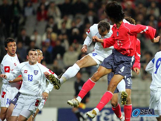 16일 저녁 서울 상암 월드컵경기장에서 벌어진 한국-세르비아 몬테네그로의 친선경기 전반 최진철(4번)이 상대 수비수에 앞서 점프, 헤딩슛으로 선제골을 뽑아내고 있다./상암=주지영 기자 jj0jj0@osen.co.kr [Copyright ⓒ OSEN(www.osen.co.kr) 무단전재 및 재배포 금지]