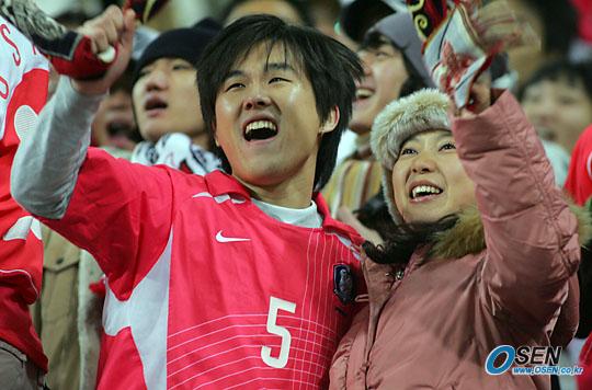 16일 저녁 서울 상암 월드컵경기장에서 벌어진 한국-세르비아 몬테네그로의 친선경기서 한국이 2-0으로 완승했다. 추운 날씨에도 아랑곳하지 않고 열심히 응원한 관중들이 한국의 승리에 기뻐하고 있다./상암=주지영 기자 jj0jj0@osen.co.kr [Copyright ⓒ OSEN(www.osen.co.kr) 무단전재 및 재배포 금지]