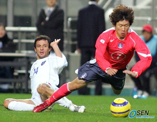 16일 저녁 서울 상암 월드컵경기장에서 벌어진 한국-세르비아 몬테네그로의 친선경기 후반 박지성이 네나드 조르제비치의 다리에 걸려 앞으로 넘어지고 있다./상암=주지영 기자 jj0jj0@osen.co.kr [Copyright ⓒ OSEN(www.osen.co.kr) 무단전재 및 재배포 금지]