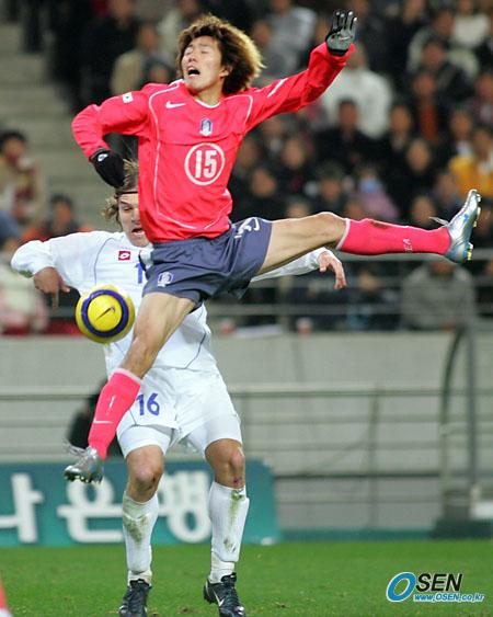 16일 저녁 서울 상암 월드컵경기장에서 벌어진 한국-세르비아 몬테네그로의 친선경기 전반 김정우가 네나드 코바체비치와 헤딩볼을 다투고 있다./상암=주지영 기자 jj0jj0@osen.co.kr [Copyright ⓒ OSEN(www.osen.co.kr) 무단전재 및 재배포 금지]