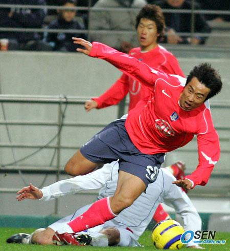 16일 저녁 서울 상암 월드컵경기장에서 벌어진 한국-세르비아 몬테네그로의 친선경기 전반 이동국이 네나드 코바체비치의 테클에 걸려 넘어지고 있다./상암=주지영 기자 jj0jj0@osen.co.kr [Copyright ⓒ OSEN(www.osen.co.kr) 무단전재 및 재배포 금지]