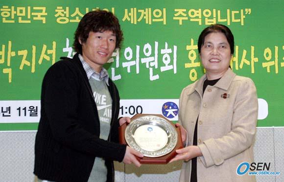 박지성이 스웨덴 및 세르비아-몬테네그로와의 친선경기를 마치고 소속팀으로 복귀하기 위해 17일 인천공항을 통해 출국하기 앞서 공항 귀빈실에서 '청소년위원회 홍보대사'로 위촉됐다. 박지성이 최영희 청소년위원회장으로부터 위촉패를 받고 있다./인천공항=손용호 기자 spjj@osen.co.kr [Copyright ⓒ OSEN(www.osen.co.kr) 무단전재 및 재배포 금지]