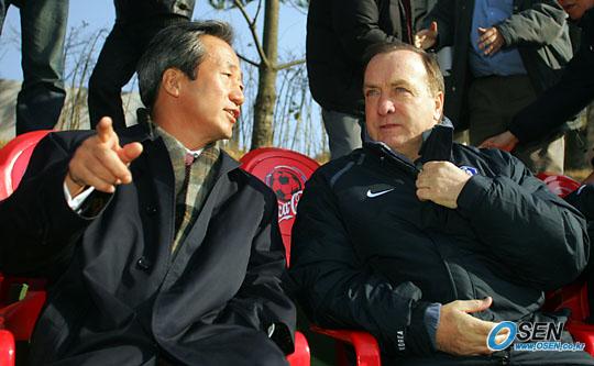 2006년도에 벌어질 AFC U-17 아시아 청소년 선수권대회의 한국-일본 예선전이 17일 오후2시 파주에서 열렸다. 아드보카트 감독과 정몽준 회장이 경기를 관전하며 이야기를 나누고 있다./파주=주지영 기자 jj0jj0@osen.co.kr [Copyright ⓒ OSEN(www.osen.co.kr) 무단전재 및 재배포 금지]