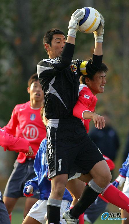 2006년도에 벌어질 AFC U-17 아시아 청소년 선수권대회의 한국-일본 예선전이 17일 오후2시 파주에서 열렸다. 양팀은 공방전 끝에 1대1 무승부로 끝났다. 일본의 히로나가가 이재훈과 부딪히면서 공을 잡아내고 있다./파주=주지영 기자 jj0jj0@osen.co.kr [Copyright ⓒ OSEN(www.osen.co.kr) 무단전재 및 재배포 금지]