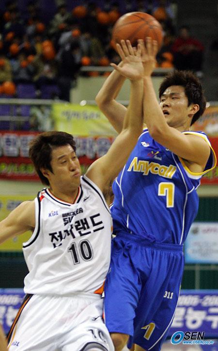 19일 인천 전자랜드 블랙슬래머와 삼성 썬더스의 부천 경기에서 드리블하는 삼성의 강혁을 문경은이 손으로 방해하며 공을 빼앗고 있다./부천=주지영 기자 jj0jj0@osen.co.kr [Copyright ⓒ OSEN(www.osen.co.kr) 무단전재 및 재배포 금지]