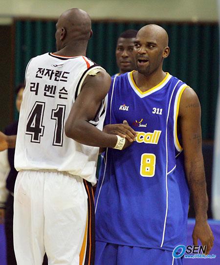 19일 인천 전자랜드 블랙슬래머와 삼성 썬더스의 부천 경기에서 89대 82로 승리한 삼성의 네이트 존슨이 리 벤슨과 인사하며 기뻐하고 있다./부천=주지영 기자 jj0jj0@osen.co.kr [Copyright ⓒ OSEN(www.osen.co.kr) 무단전재 및 재배포 금지]