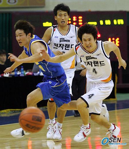 19일 인천 전자랜드 블랙슬래머와 삼성 썬더스의 부천 경기에서 전자랜드의 박규현이 강혁을 밀며 놓친 공을 향해 달리고 있다./부천=주지영 기자 jj0jj0@osen.co.kr [Copyright ⓒ OSEN(www.osen.co.kr) 무단전재 및 재배포 금지]