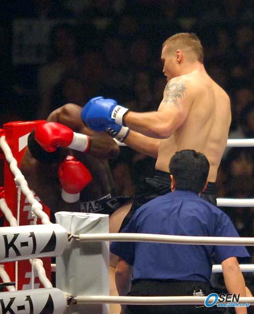 19일 일본 도쿄돔에서 열린 K-1 월드그랑프리 파이널 준결승 새미 쉴트와 디펜딩 챔피언 레미 본야스키의 경기는 쉴트가 강력한 니킥으로 본야스키의 복부를 공략 KO승을 거두는 이변을 일으켰다. 쉴트가 본야스키를 코너에 몰아 놓고 니킥으로 공격을 하고 있다./도쿄돔=송석린기자song@osen.co.kr [Copyright ⓒ OSEN(www.osen.co.kr) 무단전재 및 재배포 금지]