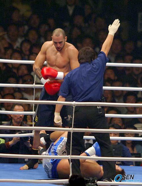 19일 일본 도쿄돔에서 열린 K-1 월드그랑프리 파이널 준결승 글라우베 페이토자와 무사시의 경기는 페이토자가 강력한 니킥을 무사시의 안면에 적중시키며 KO승을 거두었다. 페이토자가 강력한 니킥을 무사시의 안면에 적중시키자 무사시가 무너져 내리고 있다./도쿄돔=송석린기자song@osen.co.kr [Copyright ⓒ OSEN(www.osen.co.kr) 무단전재 및 재배포 금지]