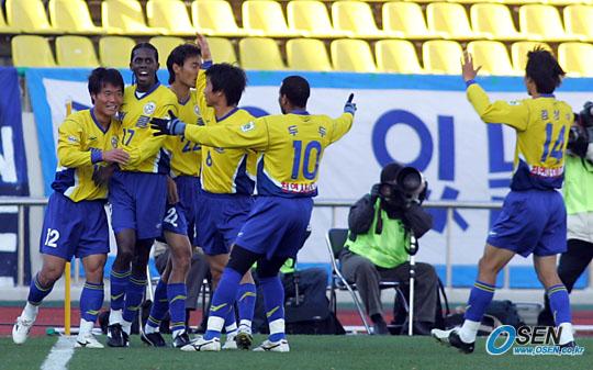 20일 성남 일화와 울산 현대의 플레이오프 전반전서 남기일이 선제골을 넣고 동료 선수들과 함께 기쁨을 나누고 있다./성남=주지영 기자 jj0jj0@osen.co.kr [Copyright ⓒ OSEN(www.osen.co.kr) 무단전재 및 재배포 금지]