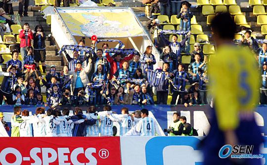 성남종합운동장에서 20일 열린 성남 일화와 울산 현대의 플레이오프서 울산 현대가 2-1 승리로 결승에 진출하게 되자 선수들이 서포터스 앞으로 달려가 기뻐하자 성남 일화의 한 선수가 부러운듯 쳐다보고 있다./성남=주지영 기자 jj0jj0@osen.co.kr [Copyright ⓒ OSEN(www.osen.co.kr) 무단전재 및 재배포 금지]