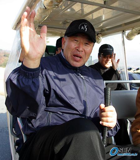21일 오전 9시부터 제 24회 야구인 골프대회가 올해 한국시리즈 우승팀인 삼성 라이온즈 후원으로 가평 베네스트 C.C에서 열렸다. 김응룡 삼성 사장이 카터를 타고 이동을 하던중 손을 흔들고 있다. /가평=주지영 기자 jj0jj0@osen.co.kr [Copyright ⓒ OSEN(www.osen.co.kr) 무단전재 및 재배포 금지]