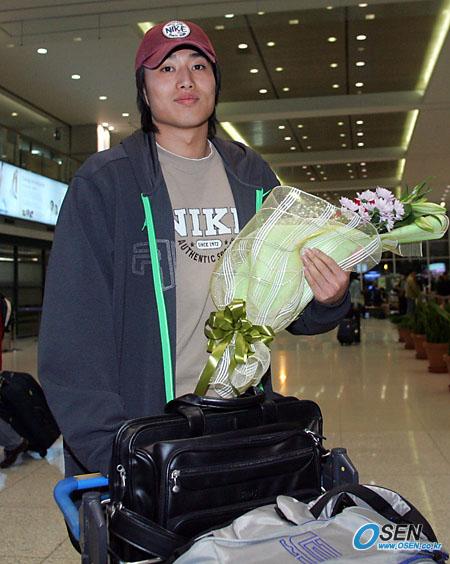 NBA 진출을 보류하고 서울 SK에 전격 입단한 방성윤이 22일 아침 로스앤젤레스에서 인천공항을 통해 귀국했다. 방성윤이 입국장을 나와 꽃다발을 받은 뒤 이동하고 있다./인천공항=주지영 기자 jj0jj0@osen,co.kr [Copyright ⓒ OSEN(www.osen.co.kr) 무단전재 및 재배포 금지]