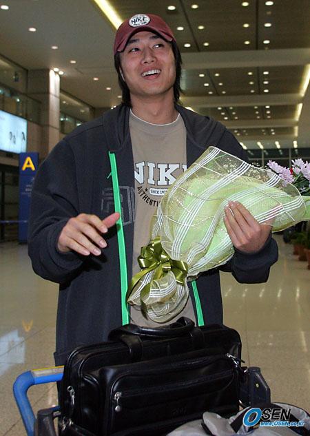 NBA 진출을 보유하고 서울 SK에 전격 입단한 방성윤이 22일 아침 로스앤젤레스로부터 인천공항을 거쳐 귀국했다. 입국장을 나와 꽃다발을 받은 방성윤이 취재진을 바라보며 웃고 있다./인천공항=주지영 기자 jj0jj0@osen,co.kr [Copyright ⓒ OSEN(www.osen.co.kr) 무단전재 및 재배포 금지]