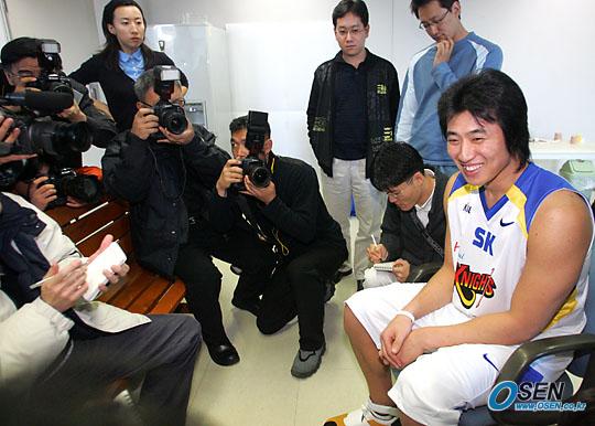 서울 SK에 전격 입단하고 22일 새벽 입국한 방성윤이 이날 오후 용인의 팀 체육관에서 첫 선을 보였다. 방성윤이 인터뷰하며 환하게 웃고 있다./용인=주지영 기자 jj0jj0@osen.co.kr [Copyright ⓒ OSEN(www.osen.co.kr) 무단전재 및 재배포 금지]