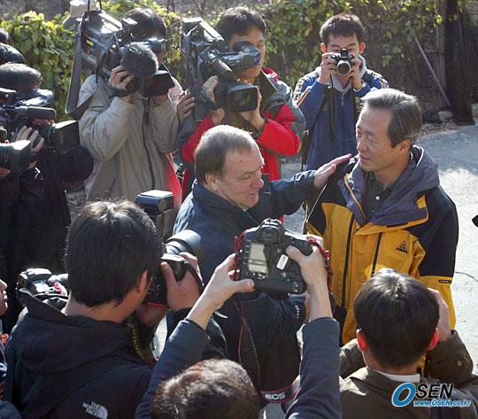 24일 오후 열린 대한축구협회 북한산 등반에 이날 일본에서 귀국한 딕 아드보카트 감독이 참가했다. 서울 평창동 매표소에 도착한 아드보카트 감독이 정몽준 협회장과 인사를 나누고 있다./북한산=주지영 기자 jj0jj0@osen.co.kr [Copyright ⓒ OSEN(www.osen.co.kr) 무단전재 및 재배포 금지]