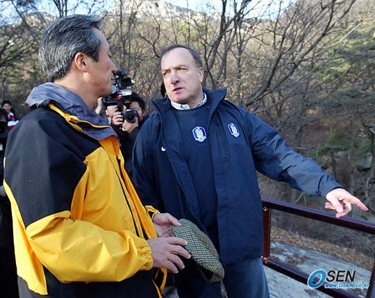 24일 오후 열린 대한축구협회 북한산 등반에 이날 일본에서 귀국한 딕 아드보카트 감독이 참가했다. 아드보카트 감독이 산을 올라가던 도중 주변을 가리키며 정몽준 협회장과 이야기하고 있다./북한산=주지영 기자 jj0jj0@osen.co.kr [Copyright ⓒ OSEN(www.osen.co.kr) 무단전재 및 재배포 금지]