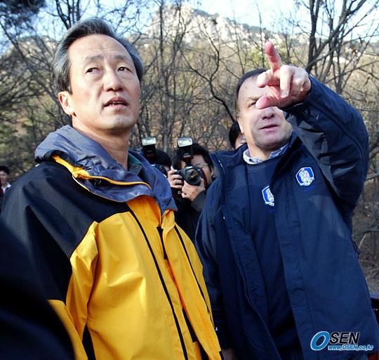 24일 오후 열린 대한축구협회 북한산 등반에 이날 귀국한 딕 아드보카트 감독이 참가했다. 정몽준 협회장과 나란히 산을 오르던 아드보카트 감독이 경치를 가리키며 이야기하고 있다./북한산=손용호 기자 spjj@osen.co.kr [Copyright ⓒ OSEN(www.osen.co.kr) 무단전재 및 재배포 금지]