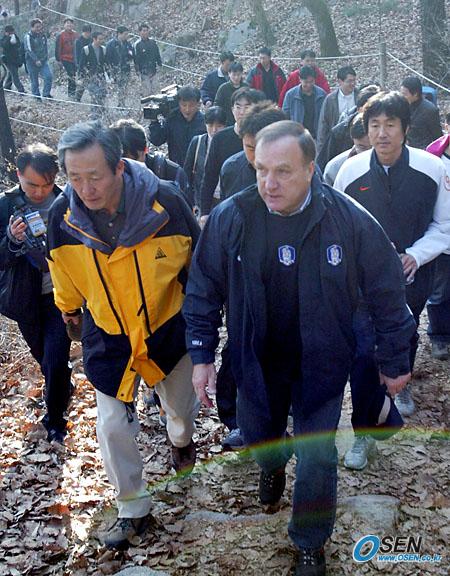 24일 오후 열린 대한축구협회 북한산 등반에 이날 일본에서 귀국한 딕 아드보카트 감독이 참가했다. 나란히 산을 오르는 아드보카트 감독과 정몽준 협회장 바로 뒤를 많은 보도진이 따르고 있다./북한산=손용호 기자 spjj@osen.co.kr [Copyright ⓒ OSEN(www.osen.co.kr) 무단전재 및 재배포 금지]