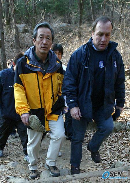 24일 오후 열린 대한축구협회 북한산 등반에 이날 일본에서 귀국한 딕 아드보카트 감독이 참가했다. 아드보카트 감독과 정몽준 협회장이 나란히 산을 오르고 있다./북한산=손용호 기자 spjj@osen.co.kr [Copyright ⓒ OSEN(www.osen.co.kr) 무단전재 및 재배포 금지]
