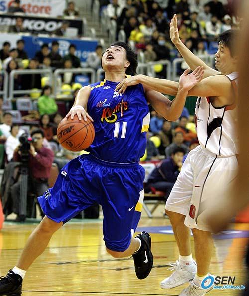미국 NBDL에서 SK로 전격 입단하며 대형 트레이드를 일으킨 방성윤이 26일 창원 실내체육관에서 벌어진 2005~2006 KCC 프로농구 창원 LG와 서울 SK전을 통해 데뷔전을 가졌다. 1쿼터서 방성윤(왼쪽)이 LG 정종선으로부터 파울을 당하고 있다./창원=손용호 기자 spjj@osen.co.kr [Copyright ⓒ OSEN(www.osen.co.kr) 무단전재 및 재배포 금지]