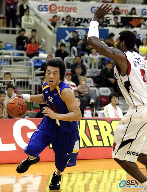 미국 NBDL에서 SK로 전격 입단하며 대형 트레이드를 일으킨 방성윤이 26일 창원 실내체육관에서 벌어진 2005~2006 KCC 프로농구 창원 LG와 서울 SK전을 통해 데뷔전을 가졌다. 1쿼터 방성윤이 LG 알렉산더를 앞에 놓고 베이스라인 쪽으로 돌파를 시도하고 있다./창원=손용호 기자 spjj@osen.co.kr [Copyright ⓒ OSEN(www.osen.co.kr) 무단전재 및 재배포 금지]