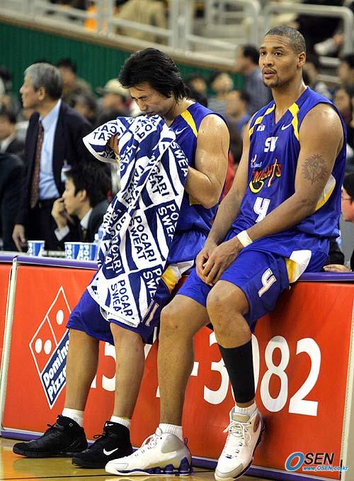 미국 NBDL에서 SK로 전격 입단하며 대형 트레이드를 일으킨 방성윤이 26일 창원 실내체육관에서 벌어진 2005~2006 KCC 프로농구 창원 LG와 서울 SK전을 통해 데뷔전을 가졌다. 2쿼터에 들어가기 전 방성윤이 주니어 버로와 광고판에 걸터 앉아 땀을 닦고 있다./창원=손용호 기자 spjj@osen.co.kr [Copyright ⓒ OSEN(www.osen.co.kr) 무단전재 및 재배포 금지]