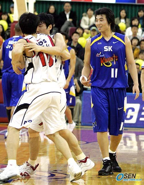 미국 NBDL에서 SK로 전격 입단하며 대형 트레이드를 일으킨 방성윤이 26일 창원 실내체육관에서 벌어진 2005~2006 KCC 프로농구 창원 LG와 서울 SK전을 통해 데뷔전을 가졌다. 2쿼터서 방성윤을 전담 마크하던 LG 정종선이 수비하던 과정에서 몸싸움 끝에 발끈하자 방성윤이 마치 '무슨 일이 있었냐'는 듯 웃고 있는 가운데 조우현이 정종손을 말리고 있다./창원=손용호 기자 spjj@osen.co.kr [Copyright ⓒ OSEN(www.osen.co.kr) 무단전재 및 재배포 금지]