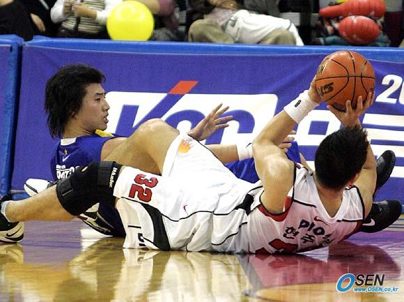 미국 NBDL에서 SK로 전격 입단하며 대형 트레이드를 일으킨 방성윤이 26일 창원 실내체육관에서 벌어진 2005~2006 KCC 프로농구 창원 LG와 서울 SK전을 통해 데뷔전을 가졌다. 2쿼터서 현주엽(오른쪽)이 방성윤과 엉키며 바닥에 흐르는 볼을 잡아내고 있다./창원=손용호 기자 spjj@osen.co.kr [Copyright ⓒ OSEN(www.osen.co.kr) 무단전재 및 재배포 금지]