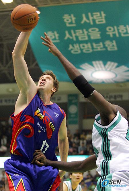 26일 원주 치악체육관에서 벌어진 2005~2006 KCC 프로농구 원주 동부와 울산 모비스의 경기서 모비스의 벤자민 핸드로그텐이 동부의 센터 자밀 왓킨스를 따돌리고 리바운드를 잡아내고 있다./원주=주지영 기자 jj0jj0@osen.co.kr [Copyright ⓒ OSEN(www.osen.co.kr) 무단전재 및 재배포 금지]