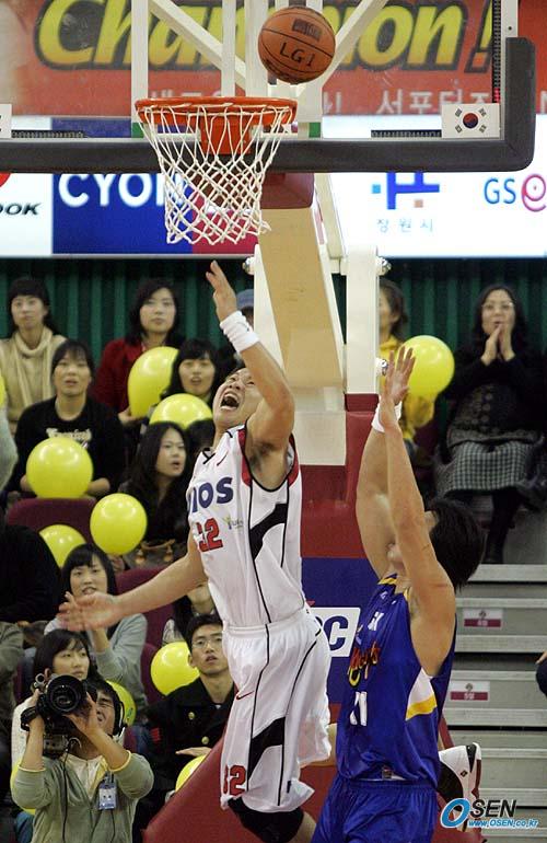 미국 NBDL에서 SK로 전격 입단하며 대형 트레이드를 일으킨 방성윤이 26일 창원 실내체육관에서 벌어진 2005~2006 KCC 프로농구 창원 LG와 서울 SK전을 통해 데뷔전을 가졌지만 3쿼터 8분 여만에 5반칙으로 물러나며 21득점을 했다. 2쿼터서 LG의 현주엽이 방성윤을 돌파해 골밑슛을 쏘고 있다./ 창원=손용호 기자 spjj@osen.co.kr [Copyright ⓒ OSEN(www.osen.co.kr) 무단전재 및 재배포 금지]