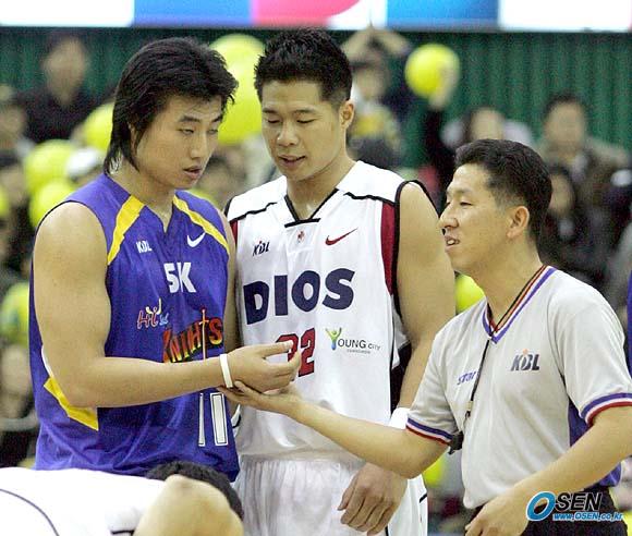 미국 NBDL에서 SK로 전격 입단하며 대형 트레이드를 일으킨 방성윤이 26일 창원 실내체육관에서 벌어진 2005~2006 KCC 프로농구 창원 LG와 서울 SK전을 통해 데뷔전을 가졌지만 3쿼터 8분 여만에 5반칙으로 물러나며 21득점을 했다. 경기에 들어가기 앞서 심판이 방성윤(왼쪽)이 착용하고 있는 팔찌를 뺄 것을 지시하고 있다./ 창원=손용호 기자 spjj@osen.co.kr [Copyright ⓒ OSEN(www.osen.co.kr) 무단전재 및 재배포 금지]