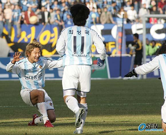 27일 인천 문학 월드컵경기장에서 벌어진 2005 삼성 하우젠 K리그 챔피언결정전 1차전서 울산 현대의 스트라이커 마차도의 헤딩 선제골을 어시스트한 이천수(왼쪽)가 한 쪽 무릎을 꿇고 이색적인 골 세리머니를 펼치고 있다./인천=손용호 기자 spjj@osen.co.kr [Copyright ⓒ OSEN(www.osen.co.kr) 무단전재 및 재배포 금지]