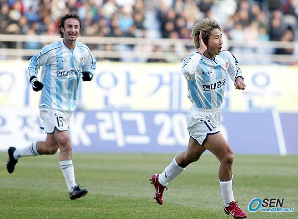 27일 문학 월드컵경기장서 벌어진 2005 삼성 하우젠 K리그 챔피언결정전 1차전 인천 유나이티드와 울산 현대의 경기 후반 이천수가 5-0을 만드는 해트트릭에 성공하고 귀에 손을 갖다대는 세리머니를 펼치는 뒤로 선제골 등 2골을 넣은 마차도가 따르고 있다./인천=손용호 기자 spjj@osen.co.kr [Copyright ⓒ OSEN(www.osen.co.kr) 무단전재 및 재배포 금지]