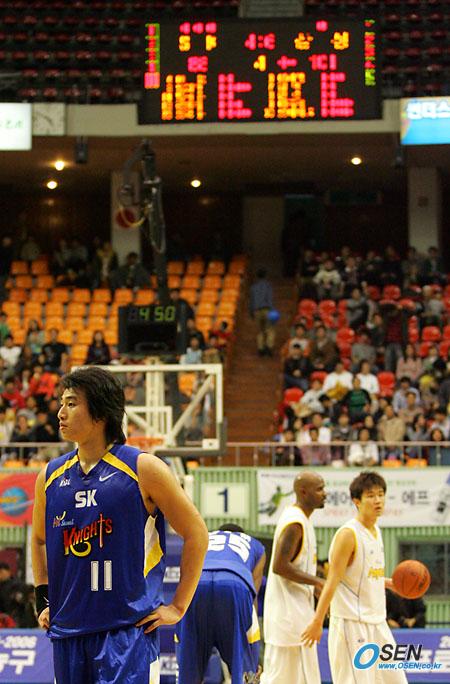27일 잠실체육관에서 벌어진 2005~2006 KCC 프로농구 삼성과 SK의 서울 라이벌전은 삼성이 101-88로 이겼다. 종료 4초를 남겨 두고 볼을 소유하고 있던 삼성 선수들이 서서 시간을 보내자 방성윤이 아쉬운 표정으로 양 손을 허리에 짚고 서 있다./잠실체=주지영 기자 jj0jj0@osen.co.kr [Copyright ⓒ OSEN(www.osen.co.kr) 무단전재 및 재배포 금지]