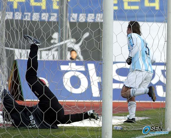 27일 문학 월드컵경기장서 벌어진 2005 삼성 하우젠 K리그 챔피언결정전 1차전 인천 유나이티드와 울산 현대의 경기는 이천수의 3골 1어시스트로 울산이 5-1로 대승을 거두며 챔피언 자리 9부 능선에 올라섰다. 울산이 3-0으로 앞서던 후반 마차도의 헤딩골이 성공되는 순간 인천 골키퍼 김이섭이 볼과 함께 골문 안에 쓰러져 있다./인천=손용호 기자 spjj@osen.co.kr [Copyright ⓒ OSEN(www.osen.co.kr) 무단전재 및 재배포 금지]
