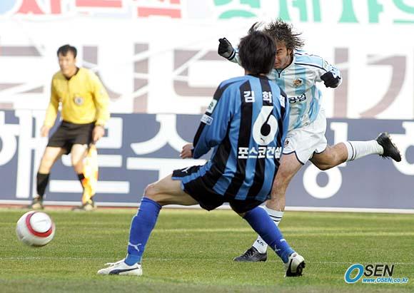 27일 문학 월드컵경기장서 벌어진 2005 삼성 하우젠 K리그 챔피언결정전 1차전 인천 유나이티드와 울산 현대의 경기는 이천수의 3골 1어시스트로 울산이 5-1로 대승을 거두며 챔피언 자리 9부 능선에 올라섰다. 울산이 3-0으로 앞서던 후반 마차도가 최성국의 어시스트를 받아 헤딩골로 연결시키고 있다./인천=손용호 기자 spjj@osen.co.kr [Copyright ⓒ OSEN(www.osen.co.kr) 무단전재 및 재배포 금지]