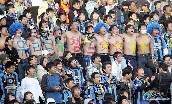 27일 문학 월드컵경기장서 벌어진 2005 삼성 하우젠 K리그 챔피언결정전 1차전 인천 유나이티드와 울산 현대의 경기는 이천수의 3골 1어시스트로 울산이 5-1로 대승을 거두며 챔피언 자리 9부 능선에 올라섰다. 인천의 서포터스들이 차가운 날씨에도 웃옷을 벗고 열렬히 응원하고 있다./인천=손용호 기자 spjj@osen.co.kr [Copyright ⓒ OSEN(www.osen.co.kr) 무단전재 및 재배포 금지]