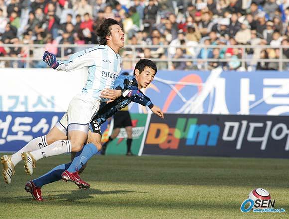 27일 문학 월드컵경기장서 벌어진 2005 삼성 하우젠 K리그 챔피언결정전 1차전 인천 유나이티드와 울산 현대의 경기는 이천수의 3골 1어시스트로 울산이 5-1로 대승을 거두며 챔피언 자리 9부 능선에 올라섰다. 경기 초반부터 양팀이 거친 플레이를 펼친 가운데 전반 인천의 장경진(오른쪽)이 울산 이호의 돌파를 파울로 저지하고 있다. 이 파울로 얻은 프리킥을 이천수가 골로 연결시겼다./인천=손용호 기자 spjj@osen.co.kr [Copyright ⓒ OSEN(www.osen.co.kr) 무단전재 및 재배포 금지]