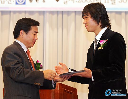 한국체육기자연맹(회장 박건만)이 주최하는 2005 자황컵 체육대상 시상식이 30일 오후 서울 올림픽파크텔에서 열렸다. FC 서울의 박주영이 프로선수상을 받고 있다./주지영 기자 jj0jj0@ [Copyright ⓒ OSEN(www.osen.co.kr) 무단전재 및 재배포 금지]