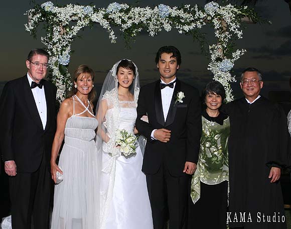 샌디에이고 파드리스 박찬호(32)가 30일(한국시간) 미국 하와이주 빅아일랜드 포시즌 호텔에서 재일동포 3세 박리혜 씨(29)와 결혼식을 올렸다. 재미동포 문대양 하와이주 대법원장의 주례로 치러진 이날 식에는 박찬호의 아버지 박제근씨와 어머니 정동순 씨, 매형 김만섭 팀61 대표와 피터 오말리 전 LA 다저스 구단주 , 공주고 동창인 홍원기를 비롯해 가족과 친지 등 30여 명이 참석해 비공개로 진행됐다. 문대양 씨 부부 및 오말리 전 구단주 부부와 함께 포즈를 취한 박찬호 부부. /팀61,카마스튜디오 제공