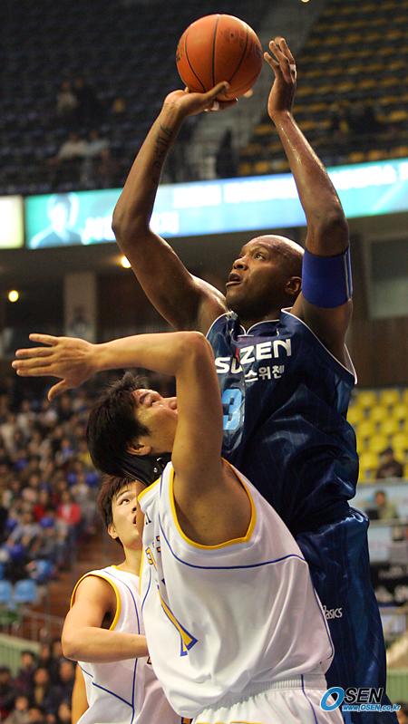 30일 잠실체육관에서 벌어진 2005~2005 KCC 프로농구 서울 삼성과 전주 KCC의 경기서 KCC의 쉐런 라이트가 138kg의 체중으로 삼성 서장훈을 밀며 슛을 날리고 있다./잠실체=주지영 기자 jj0jj0@osen.co.kr [Copyright ⓒ OSEN(www.osen.co.kr) 무단전재 및 재배포 금지]